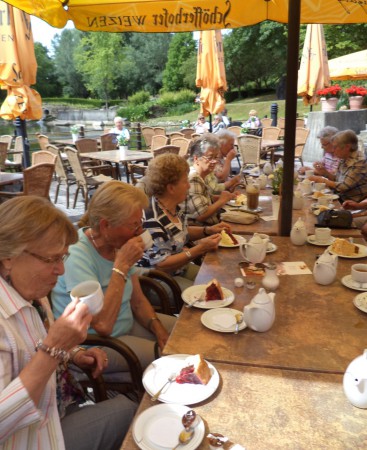 Bei strahlendem Sonnenschein saßen wir auf der Terrasse des Lokals und ließen uns Kaffee und Tee sowie leckere Torte oder Waffeln mit Kirschen und Eis schmecken. Anschließend hatte man reichlich Zeit sich zu unterhalten oder, wer wollte, einen Spaziergang durch den Park zu unternehmen.