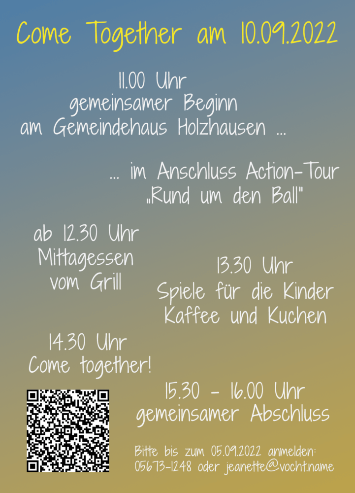 Bitte bis spätestens 5. September anmelden unter: Pfarramt: 05673-1248 oder unter jeanette(at)vocht.name!