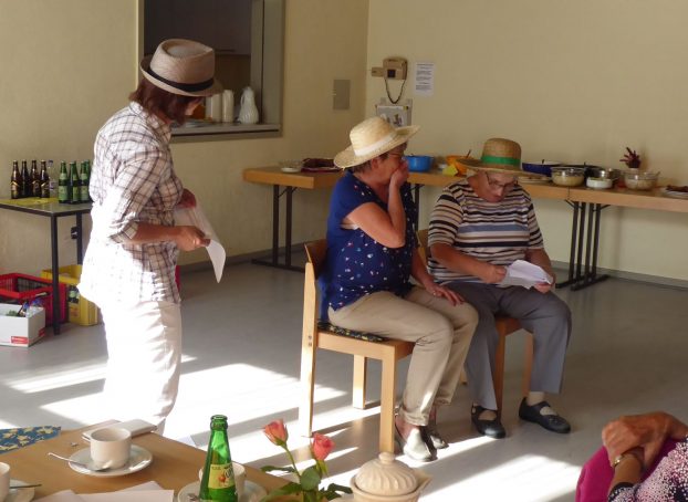 Elfriede und Gabi lasen uns schöne Geschichten vor, ein lustiger Sketch, gespielt von Sylvia, Minchen und Gaby, bekam viel Beifall. Natürlich kam das Schnuddeln nicht zu kurz, zur Auflockerung sangen wir alle noch das Holzhäuser Heidelbeerlied und weitere Lieder. Die 2 Stunden gingen so schnell vorbei, nun hieß es Schluss zu machen. Wir bedankten uns bei den fleißigen Küchenhilfen und bei Silvia für die gute Vorbereitung und wünschten Allen ein gutes Nachhause kommen.
