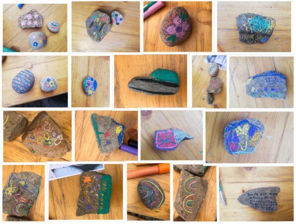 Hier sehen Sie eine Collage der Steine, die von den Kindern bemalt wurden.