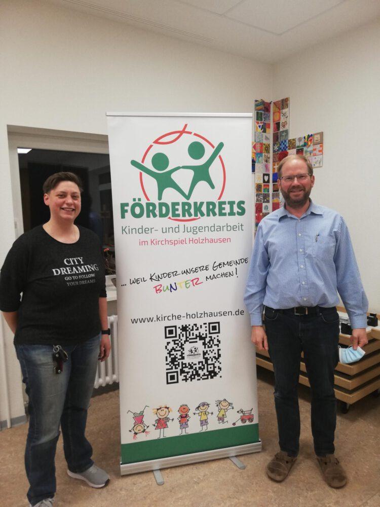 Der Förderkreis für Kinder- und Jugendarbeit im Kirchspiel Holzhausen – Wilhelmshausen – Knickhagen freut sich über einen „Roll-Up.“ Dieser wurde von Christof Fleck (mit Unterstützung des gesamten Förderkreises) gestaltet und soll bei zukünftigen Aktionen zum Einsatz kommen. Auf dem Foto präsentieren Anika Heinemann (li., Kirchenvorstand Knickhagen & Mitglied des Förderkreises) sowie Pfarrer Christian Brandt den Roll-UP im Gemeindehaus Holzhausen.