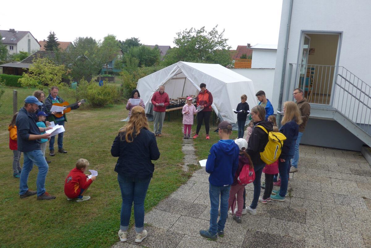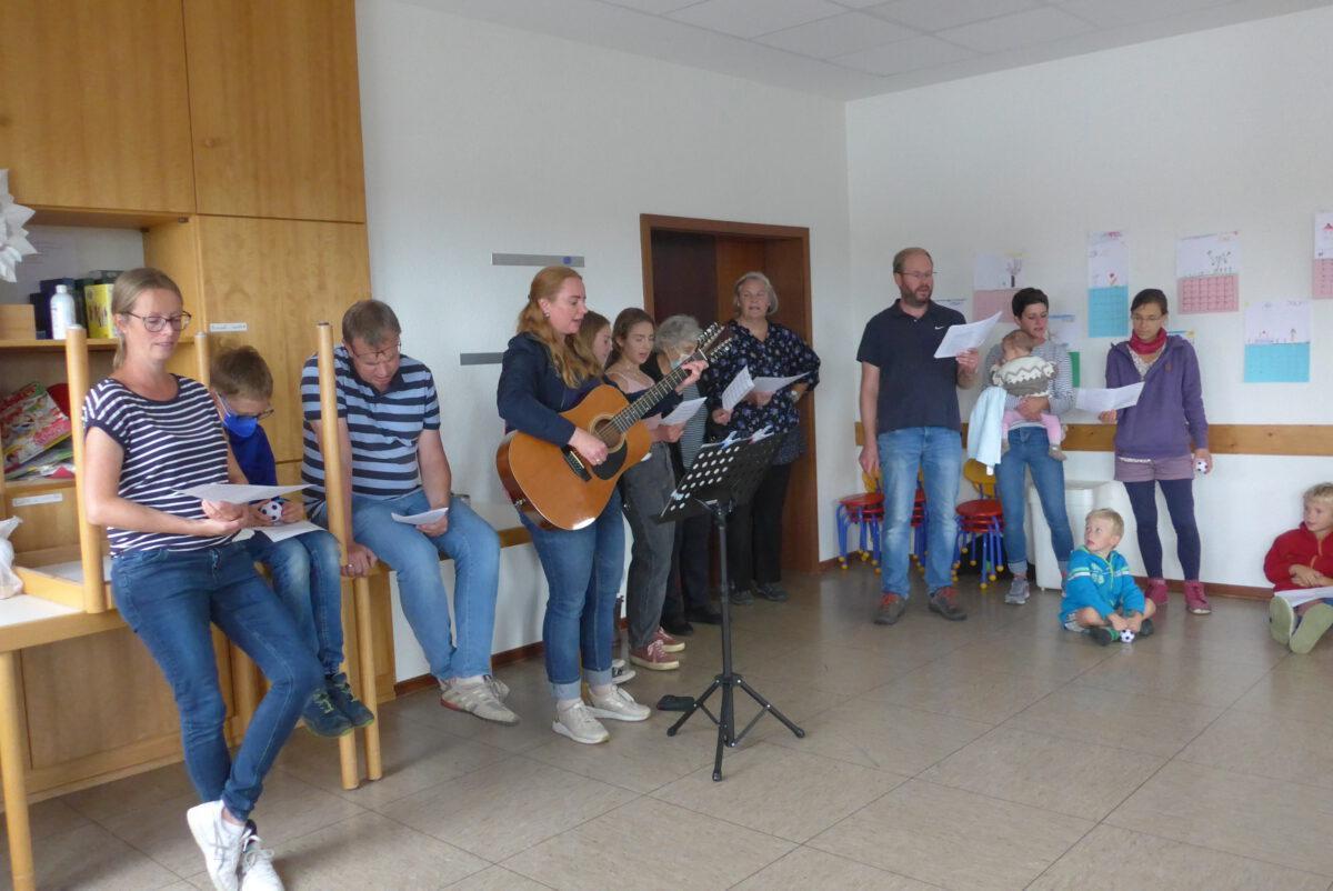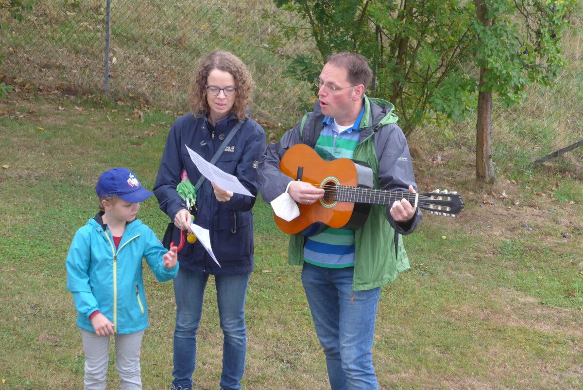 Um 11:00 Uhr begrüßte Pfarrer Christian Brandt die Gäste mit Zitaten aus der Fußballwelt und dem gemeinsamen Lied „Volltreffer“ von Daniel Kallauch, welches Bastian Fleck auf der Gitarre begleitete.