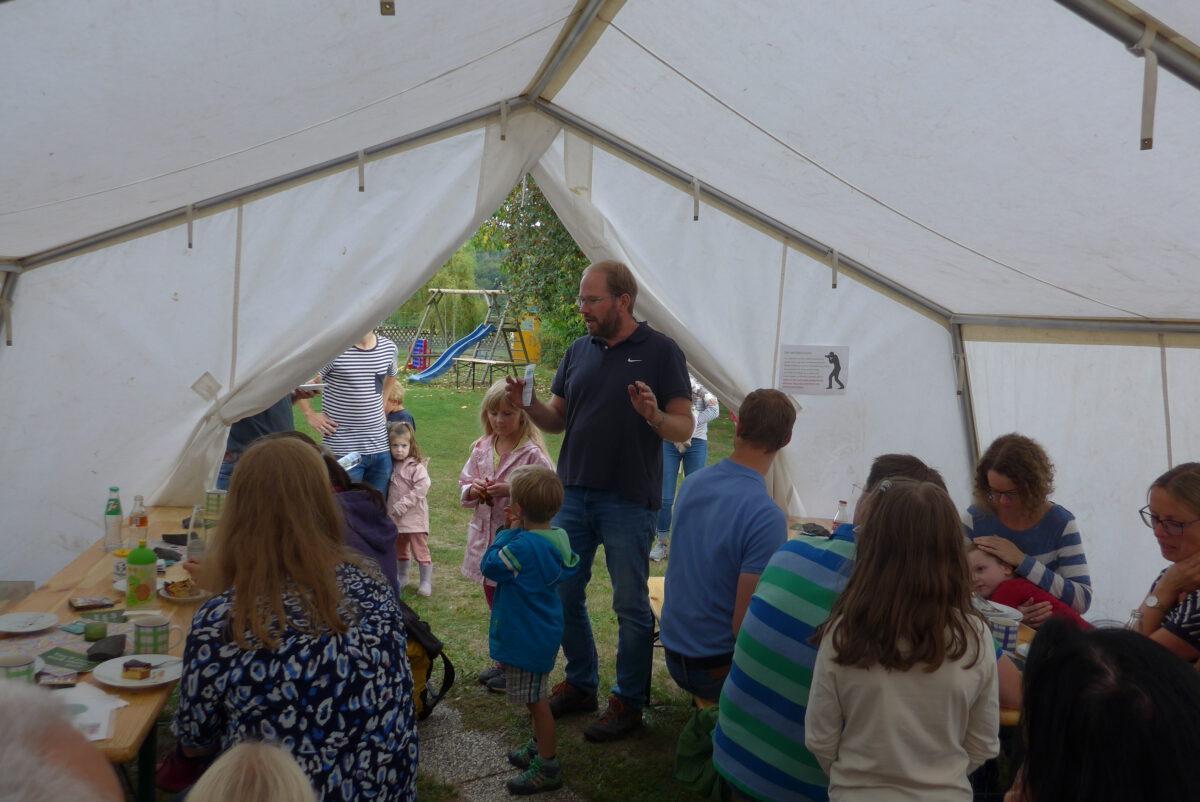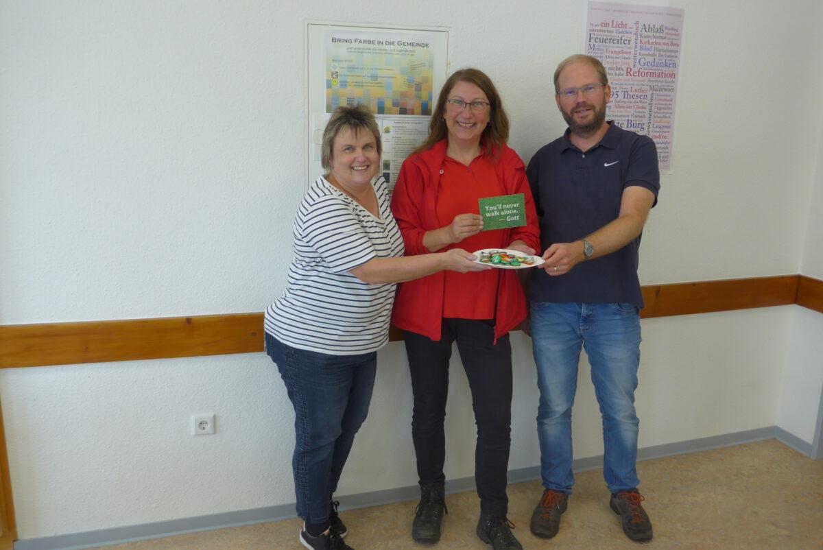 Sitzmöglichkeiten gab es im Pfarrgarten (vielen Dank an das DRK Holzhausen für das Bereitstellen des Zeltes sowie von Tischen und Bänken) und auch im Gemeindehaus an gemütlichen Tischgruppen. Dort lagen sowohl Desinfektionstücher („Gott segne und behüte dich!“) als auch „You´ll-never-walk-alone-Postkarten und WM-Spielpläne mit Zitaten berühmter Fußballer zum Mitnehmen aus.