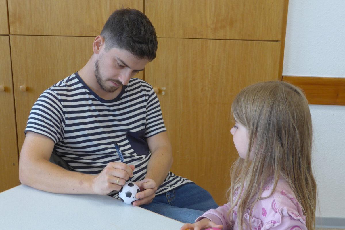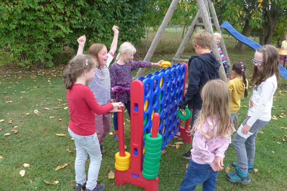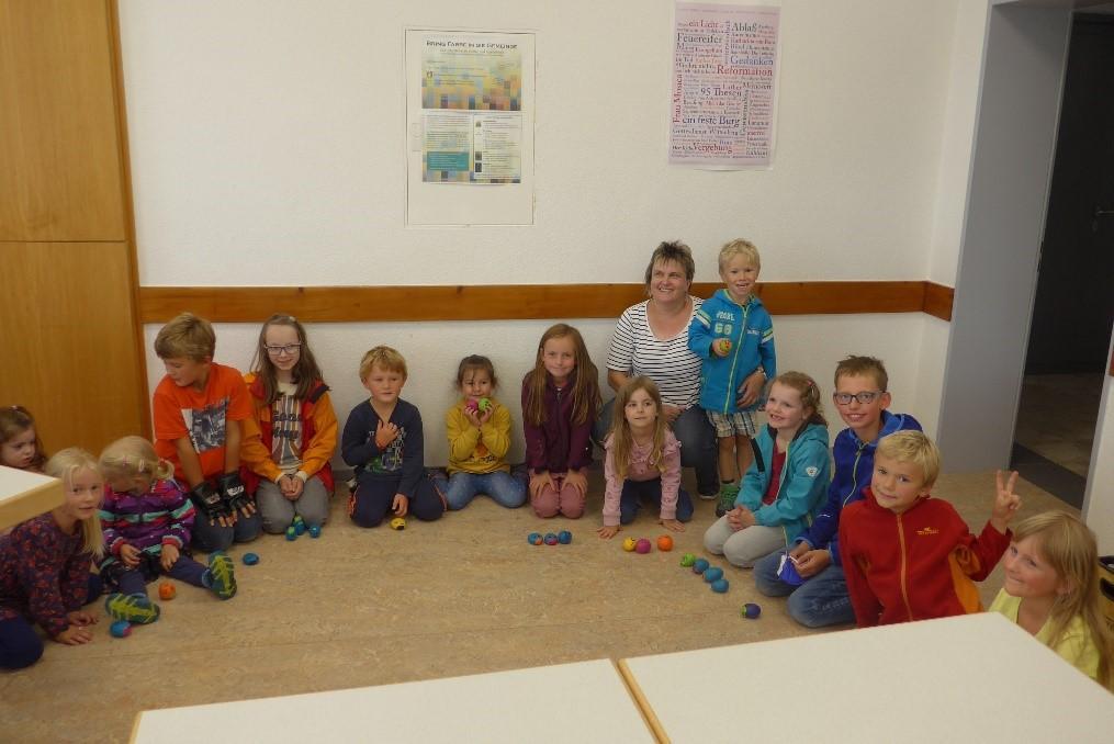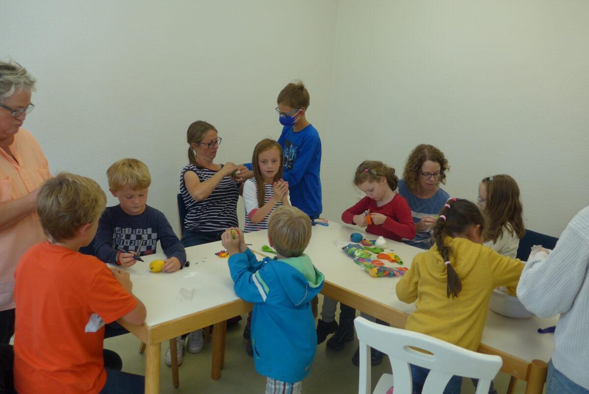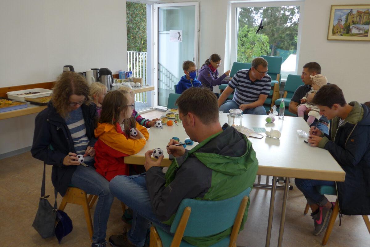Gestärkt und voller Elan ging es für alle dann mit Spiel, Spaß und einem Workshop weiter. Jugendreferent Arne Marinelli hatte Spiele (wie z.B. ein XXL-4-Gewinnt-Spiel, Dosenwerfen, Wikinger-Schach oder ein Volleyball-Netz) im Pfarrgarten aufgebaut. Dort spielten nicht nur die Kinder, sondern auch die Erwachsenen hatten ihren Spaß und kamen schnell untereinander ins Gespräch. Im Gemeindehaus bot Monika Neumann-Täubel den Workshop „Wutball basteln“ an. Aus Mehl und Luftballons konnte sich jeder seinen eigenen „Wutball“ herstellen und mit nach Hause nehmen. Auch so mancher Erwachsene nahm das Angebot an und stellt sich seinen eigenen „Anti-Stress-Ball“ her.