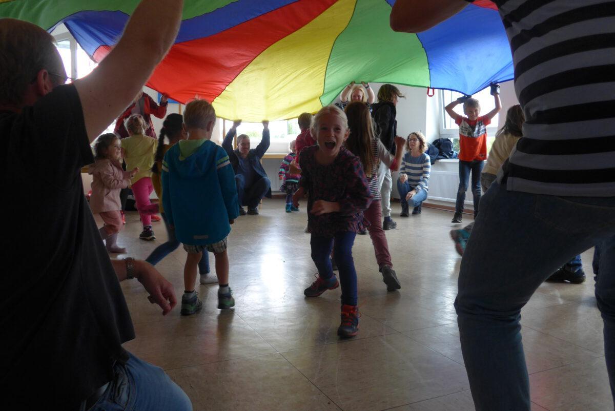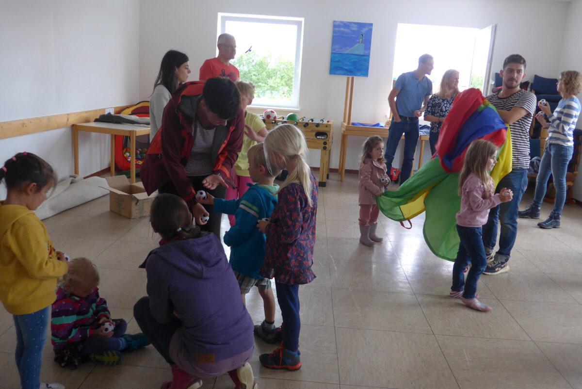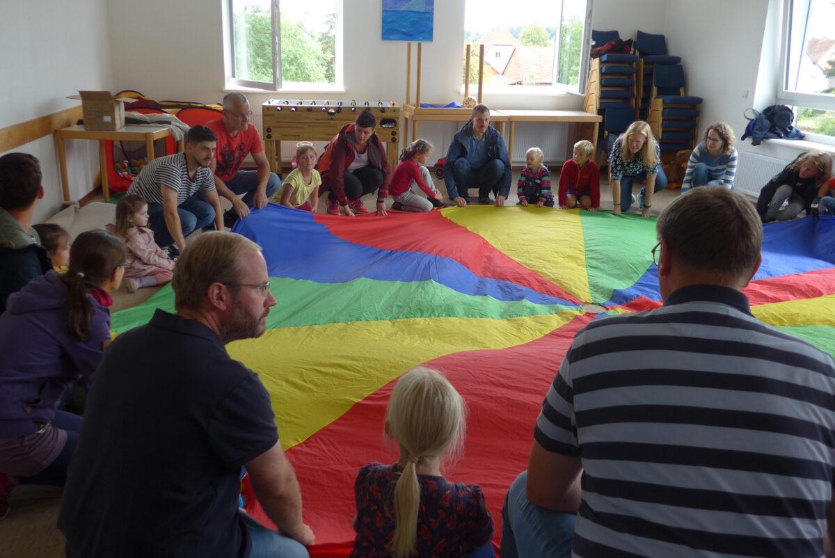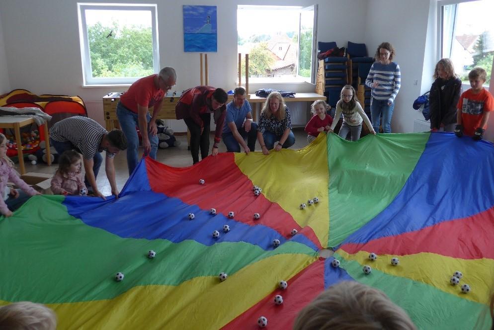 Viel zu schnell war die Zeit vorüber gegangen, als Pfarrer Brandt und Arne Marinelli schon zum Come-Together alle zusammenriefen. Jeder bekam einen kleinen Fußball, auf dem er etwas Ermutigendes schreiben (oder die Kinder malen) sollte. Dann ging es gemeinsam an den großen bunten Fallschirm. Es wurde ausprobiert, was man damit alles machen kann – erst ohne Bälle, dann mit Bällen und zum Schluss mit den kleinen Fußbällen, auf denen die „Ermutigungen“ standen. Jeder durfte sich einen dieser Fußbälle als ermutigende Erinnerung mit nach Hause nehmen.