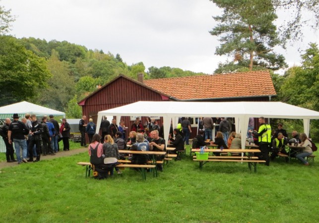 Gut und reichlich war dann die Wilhelmshäuser Gastfreundschaft: Die Feuerwehr hatte für Zelt und Sitzplätze gesorgt, die Kirchenvorsteherinnen und Kirchenvorsteher schenkten das bei kühlem Wetter wichtigste Lebensmittel aus: Viel Kaffee. Sie kümmerten sich um alles, was die Gäste aus nah und ziemlich fern zum Wohlfühlen brauchten. Für gegrillte Würstchen sorgten die „Blue Knights“, ein Polizei-Motorrad-Club.