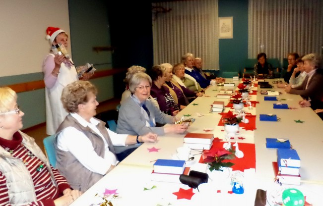 Höhepunkt des Nachmittags war das Geschenkewürfelspiel. Jede Besucherin erhielt einen Stern mit einer Zahl. Bei einer „sechs“ wurden alle Sterne nach rechts weitergegeben und bei einer „drei“ nach links. Manchmal war das gar nicht so einfach, wenn man nicht genau aufpasste und rechts und links verwechselte. Dann rief plötzlich jemand: „Ich habe keinen Stern!“ „Bei mir sind jetzt zwei Sterne?“ Hier galt es schnell den Sternenstau zu beseitigen.