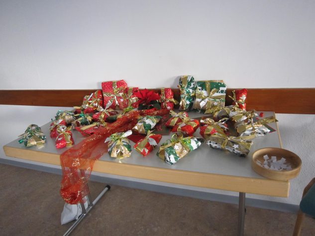 Natürlich hatte der Nikolaus schon vorab Geschenke für alle Besucherinnen vorbeigeschickt. Sie waren rechtzeitig im Gemeindehaus eingetroffen. Allerdings war eine Bedingung darin geknüpft. Es mussten 3 Steine mit gleicher Farbe gefunden und dann noch eine „sechs“ gewürfelt werden, ehe man ein Los ziehen konnte und sein entsprechendes Geschenk erhielt. Dieses Spiel machte allen viel Spaß. Die letzten drei Frauen wurden von allen anderen kräftig angefeuert nun endlich eine „sechs“ zu würfeln, damit man dann zusammen die Geschenke auspacken durfte. Auch die Mitarbeiterinnen bekamen von den Besucherinnen ein schönes Präsent. Vielen Dank dafür.