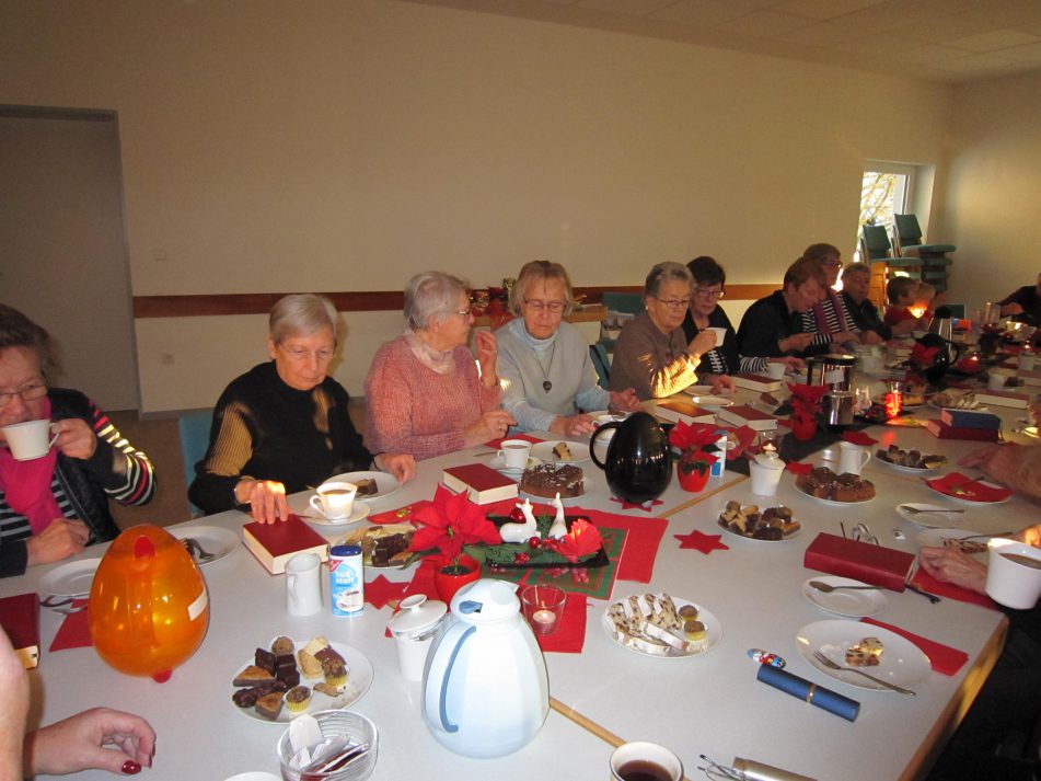 Zur diesjährigen Adventfeier fanden sich 26 Besucherinnen im Gemeindehaus in Holzhausen ein, so dass an unserer festlich geschmückten Tafel kein Platz mehr frei blieb. Das hat uns, die Mitarbeiterinnen, sehr gefreut. Nach der Begrüßung, einem Adventlied und dem Gedicht „Weihnachtswunschzettel aus dem Jahre 1947“ hörten wir zwei Geschichten. Zum einen eine historische wahre und nachdenkliche Erzählung „Erinnerungen an Weihnachten nach dem Krieg“ und eine lustige „die Engel Ramona und Andrea“.