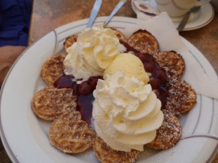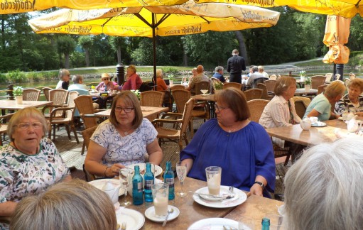 Bei strahlendem Sonnenschein saßen wir auf der Terrasse des Lokals und ließen uns Kaffee und Tee sowie leckere Torte oder Waffeln mit Kirschen und Eis schmecken. Anschließend hatte man reichlich Zeit sich zu unterhalten oder, wer wollte, einen Spaziergang durch den Park zu unternehmen.