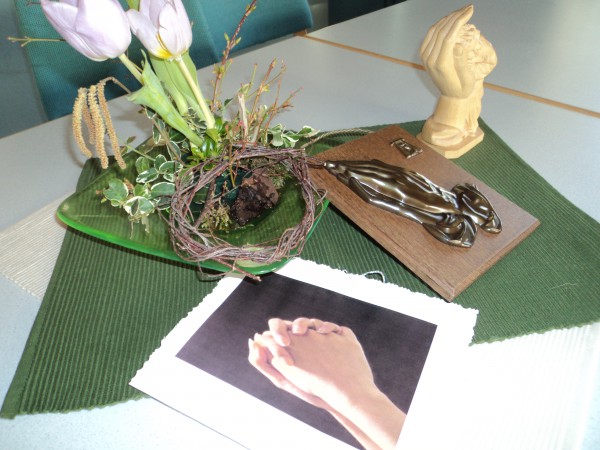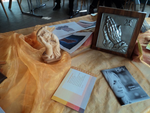 Wir erfuhren über die Gebetshaltung(gefaltete Hände, aneinander gelegte Hände, ausgestreckte Hände) und die Vielzahl der Gebetsmöglichkeiten. Es gibt Gebete für den Morgen, Mittag und Abend. Für in Not geratene Menschen, für den Frieden, für Kranke und für Sterbende um nur einige zu nennen. Jede Besucherin hatte die Möglichkeit, ihr Lieblingsgebet vorzulesen oder ein anderes schon vorbereitetes Gebet. Gemeinsam sangen wir Lieder, die alle dem Thema angepasst waren.