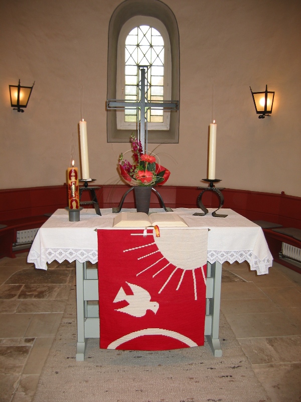 Bauweise: schlichter Sandsteinbau mit kleiner Apsis