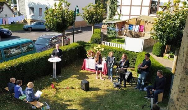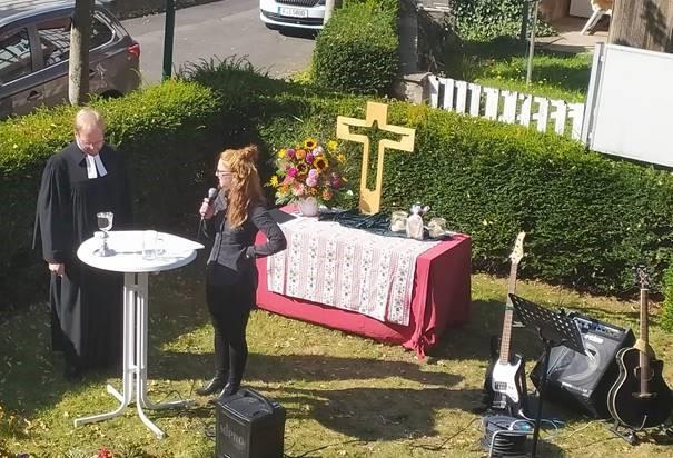 Obwohl es ja ein Open-Air Gottesdienst war, kam die Orgel zum Einsatz, die Bastian Fleck spielte. Wie schon bei der Konfirmation, bereicherten Jeanette und Christopher Vocht mit ihren Töchtern den Gottesdienst mit ihrem musikalischen Talent. Hierbei hat Familie Vocht mit ihrer Gesangseinlage den Predigtinhalt untermauert: Wir leben in besonderen Zeiten, in denen vieles nicht so ist, wie wir es gerne hätten. Ein Lied, das in diese Zeit passt, hat ein Musikerehepaar in den Wochen nach den Anschlägen vom 11. September 2001 geschrieben: Angelehnt an den biblischen Bericht von Hiob, der seinen gesamten Besitz und seine Kinder verloren hat und mit den Worten reagierte „der Herr hat gegeben, der Herr hat genommen, der Name des Herrn sei gepriesen“, haben sie formuliert, dass Dankbarkeit nicht nur in den Zeiten wichtig ist, in denen alles gut läuft, die Sonne scheint und es dem Land gut geht, sondern eben auch, wenn der Weg schwierig ist, durch die Wüste führt und das Leben mit Schmerz verbunden ist. „Jeden Segen, den Du mir schenkst, gebe ich in Lob zurück und wenn die Dunkelheit über mich hereinbricht, werde ich immer noch sagen: der Name des Herrn sei gepriesen!“