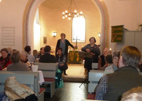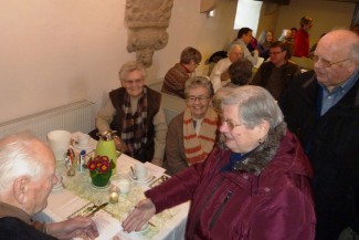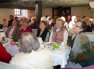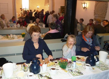Gudrun Brede begrüßte etwa 60 Gäste aus Holzhausen, Immenhausen und Wilhelmshausen und wies auf das Rahmenthema Frühling hin, das später in Gedichten und Worten Impuls und Anregung sein sollte. Nach dem Lied „Tageserwachen“ zur Einstimmung und dem gemeinsamen Tischlied gab es dann beim Kaffee-Klatsch in den Kirchenbänken an den frühlingsfrisch gedeckten Tischen beim Essen einen guten Gedankenaustausch.