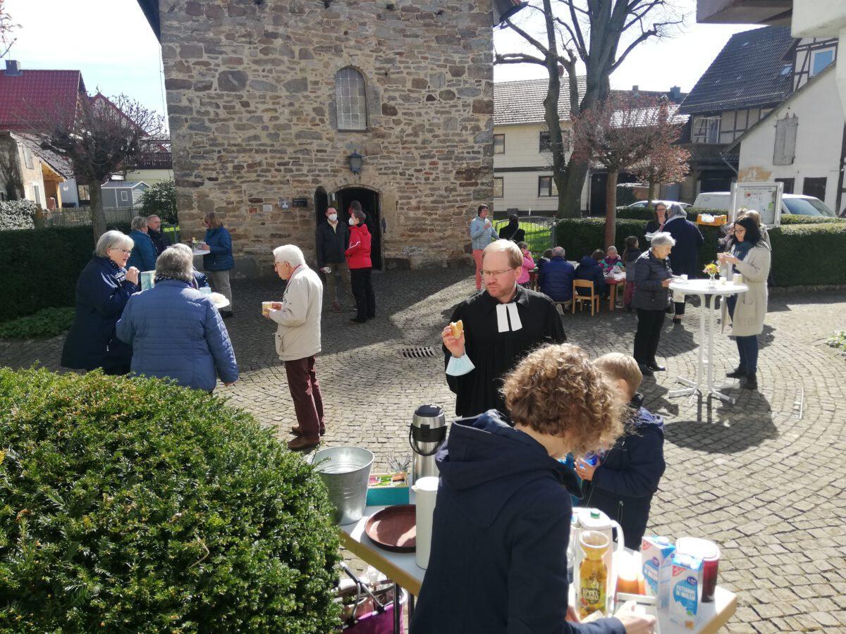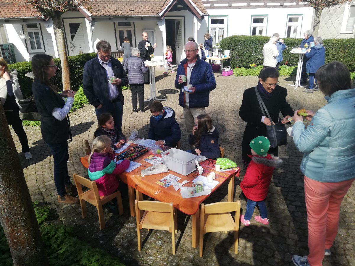 Im Anschluss an den Gottesdienst gab es vor der Kirche Osterbrot, Kaffee & Tee für die Erwachsenen sowie eine kleine Rallye mit Ostereiersuche (rund um die Kirche herum) für die Kinder. Jedes Kind bekam ein Ostermalbuch, das auch schon vor Ort an einem kleinen Maltisch ausgemalt werden konnte, und eine „süße Überraschung“. Bei strahlendem Sonnenschein genossen ca. 35 GottesdienstbesucherInnen eine wohltuende Gemeinschaft.