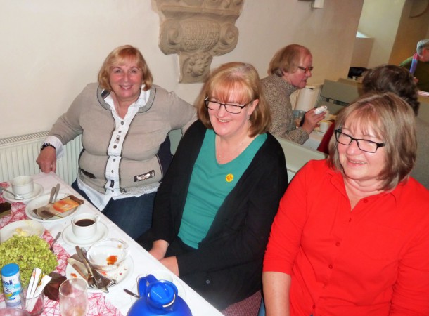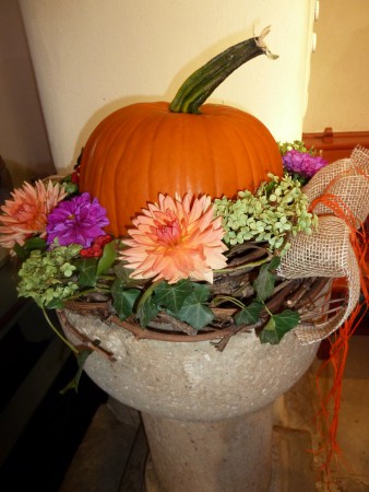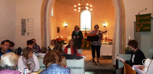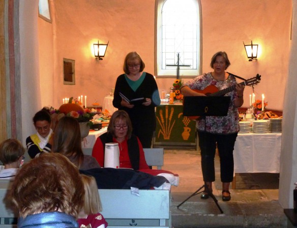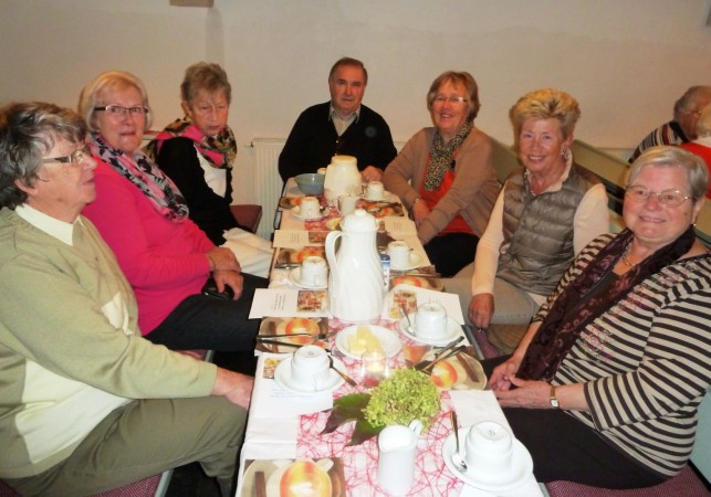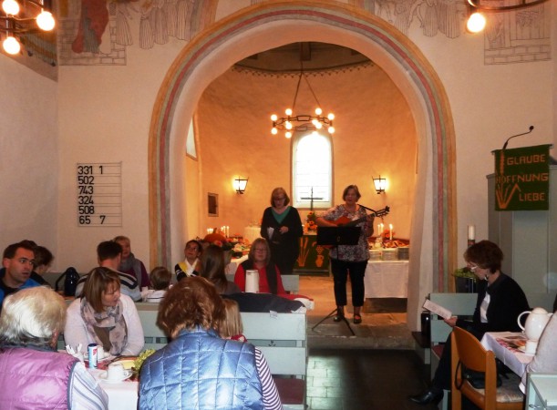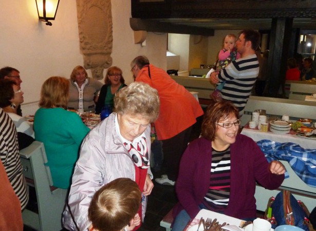 Gudrun Brede begrüßte 54 Erwachsene und neun Kinder und stellte treffend fest, dass aus allen Lebensjahreszeiten vom frühlingshaften 4 Monaten jungen Säugling über Kinder, junge Erwachsene, reife Generationen bis hin zur 85-Jährigen alle Lebensphasen vertreten waren. Der Herbst, der die Ernte, aber auch eine Zeitenwende zu dunkleren Tagen versinnbildlicht, war das Thema für Gedichte und Impulse. Eingefasst vom musikalischen Ein- und Ausklang mit gemeinsamen Liedern, gab es nach dem gesungenen Tischlied einen echten „Kaffee-Klatsch“ und beim Essen einen guten Gedankenaustausch. Nachdenkliches zum Herbst als Jahresezeit des Lebens, zu dem was uns bewegt, wenn der Sommer vorbei ist, was uns an grauen Tagen beschäftigt, uns über unser Leben nachdenken lässt, aber auch die Freude an der „Ernte des Lebens“, an der Vielfalt der Herbst- und Lebensfarben, die gemütlichen Stunden, das Versprechen von Weihnachten und Vorfreude auf den nächsten Frühling gab es in kurzen Beiträgen und Liedern. „Gott sei Dank“ hieß es dann auch im schönsten Wortsinn für diesen herbstlichen Strauß an Gedanken und allem was wir haben auf einer Karte zum mitnehmen. Mit dem Segenslied des MEA-Teams „Hand in Hand“ wurde der gemeinsame Vormittag geschlossen. Freuen Sie sich auf das nächste Gemeindefrühstück am 13.Februar 2016 oder noch in diesem Jahr auf die Stille im Advent.