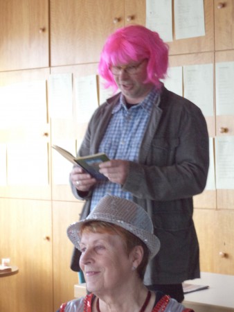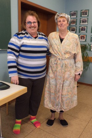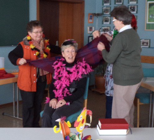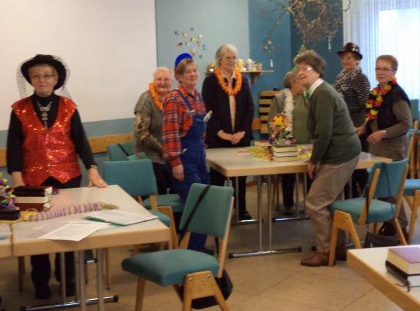 Auch bei der „Offenen Tür“ war es diesmal ein wenig verrückt. Unser Pfarrer, mit pinkfarbener Perücke, las lustige Geschichten vor. Direkt gegenüber von Damen mit tollen Hüten hatte ein Bauarbeiter Platz genommen. Dieser „Herr“ amüsierte sich köstlich über einen „Fachmann“, der beim tapezieren große Schwierigkeiten hatte.