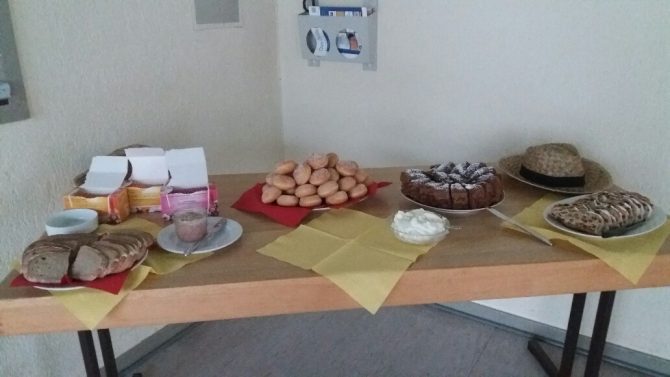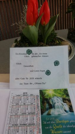 Am 31. Januar 2018 durften wir zu unserer „Offenen Tür“ 19 Gäste herzlich begrüßen und begannen mit dem Lied: „Komm Herr segne uns“. Wir wünschten uns guten Appetit, es gab Kaffee, leckeren Kuchen, selbstgebackene Kreppeln und verschiedene kalte Getränke. Die Tische waren passend zum Karneval mit Papierschlangen und Konfetti dekoriert. Nach dem Kaffeetrinken trugen Traudel, Silvia, Waltraud, Gab und Marga einen lustigen Sketch vor, der für viel Heiterkeit sorgte.