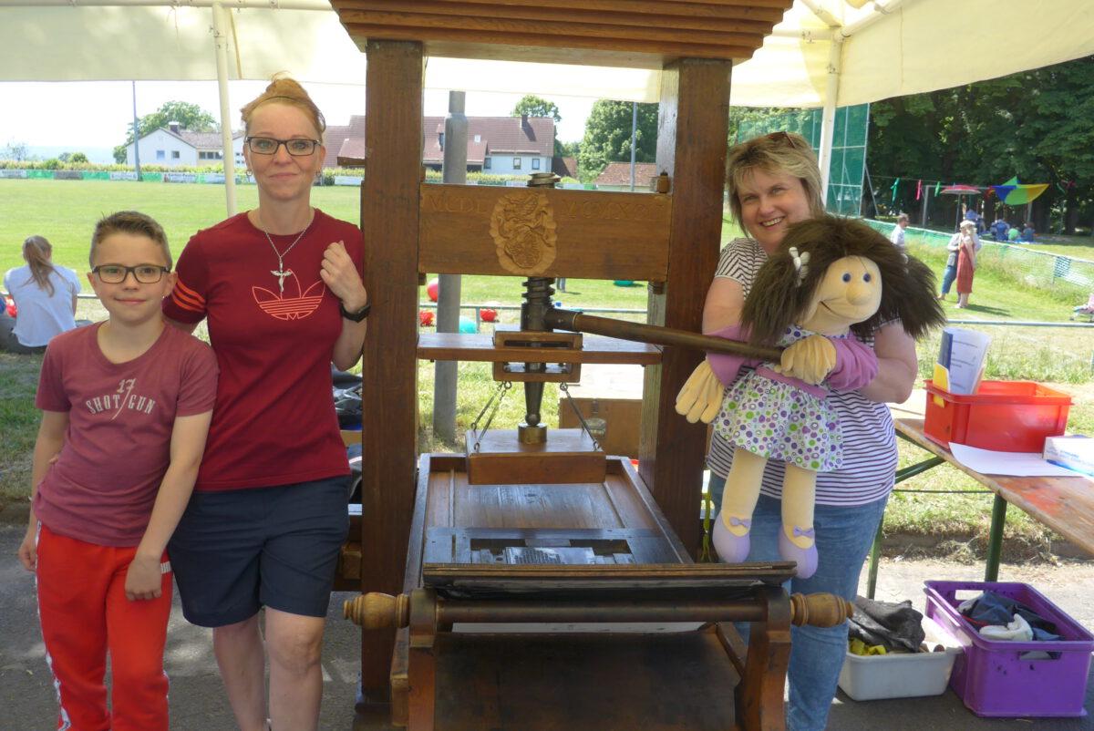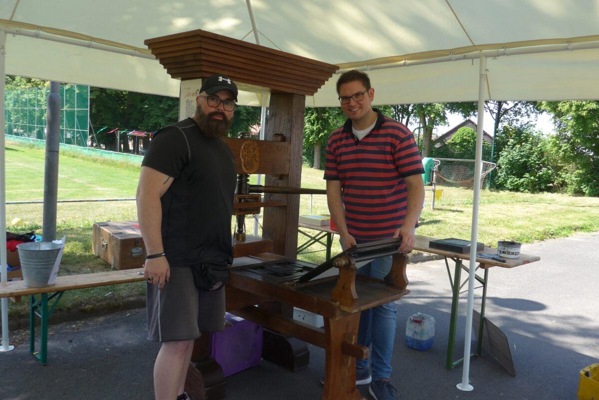 Im Rahmen der 1.000-Jahr-Feier hatte die Vereinsgemeinschaft Holzhausen zu einem Kindertag rund um das Bürgerhaus eingeladen. Unter dem Motto „Rund ums Handwerk früher“ war auch die Jugendarbeit des Kirchspieles, unter der Leitung von Arne Marinelli, und der Förderkreis Kinder- und Jugendarbeit vertreten. Bei sonnigem Wetter konnten sich alle an der Bibeldruckpresse ausprobieren und einen eigenen Druck des „Vater unser“ mit nach Hause nehmen. Jung und Alt waren fasziniert von der imposanten und massiven Druckerpresse und ließen sich die einzelnen Schritte genau erklären. Die Kinder staunten, wie aufwendig und anstrengend es früher war, nur ein einziges Blatt mit nur einer Farbe zu bedrucken und waren am Ende sehr stolz auf ihr eigenes Exemplar. Gegen eine Spende gab es auch wieder die genähten Stofftaschen und die selbst gegossenen Seifen. Es war ein rundum gelungener Tag mit sehr vielen tollen Besuchern und guten Gesprächen. Herzlichen Dank an die Organisatoren.