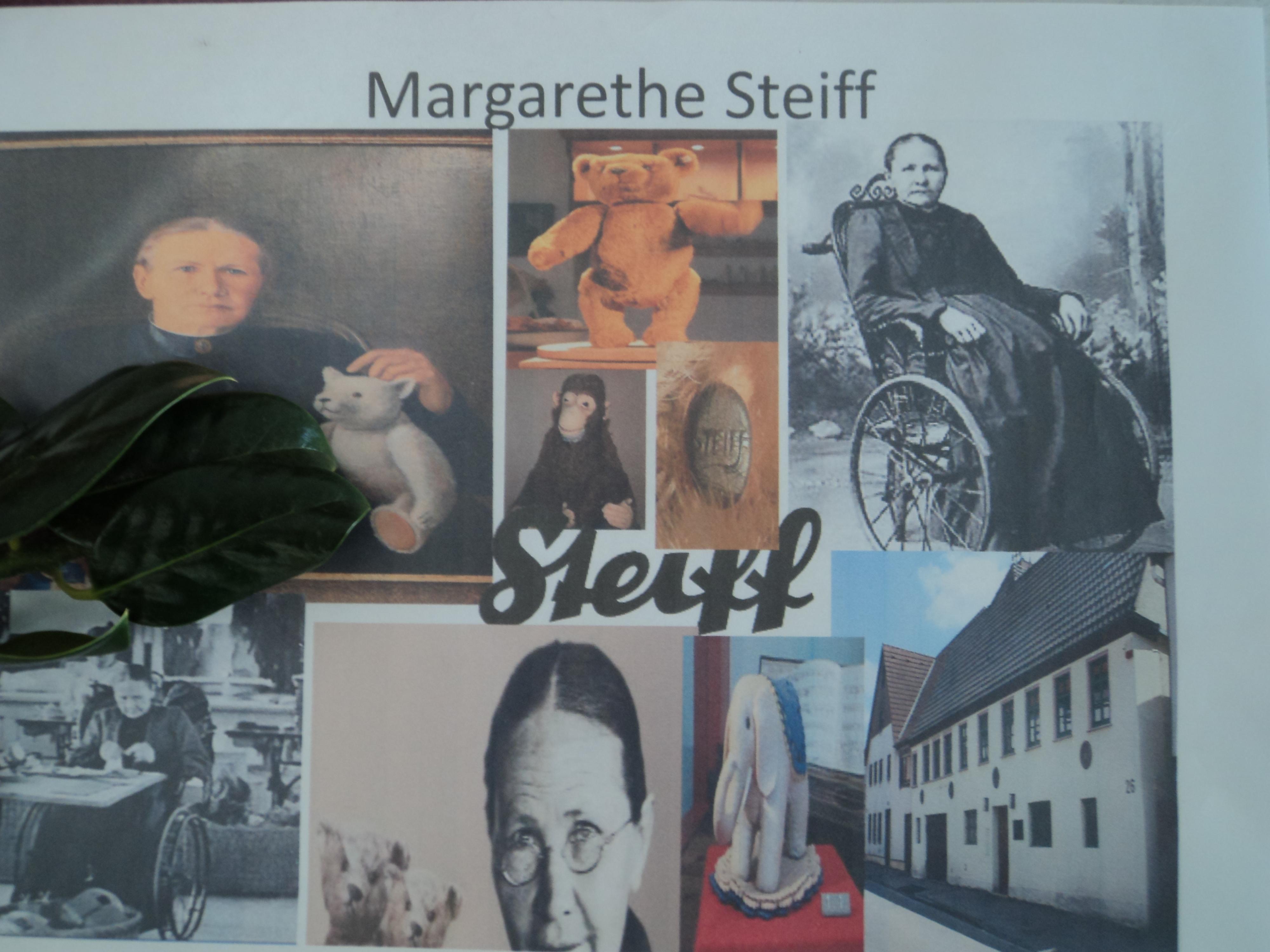 Margarete Steiff wurde am 24.7.1847 in Giengen an der Brenz geboren. Mit 18 Monaten erkrankte sie an Kinderlähmung. Nach einer Operation an ihren Beinen im Jahre 1856, die aber keine Besserung brachte, kam Margarete zu einer mehrmonatigen Kur nach Bad Wildbad. Hier fasste sie den Entschluss die Nähschule zu besuchen und wurde bald eine gute Schneiderin. Im umgebauten Elternhaus richteten Margarete und ihre beiden Schwestern eine Schneiderei ein und kauften als erste im Ort eine Nähmaschine. Aus dem Laden entwickelte sich ein kleines Unternehmen mit mehreren fest angestellten Näherinnen. Im Jahre 1879 entdeckte Margarethe Steiff in einer Modezeitschrift das Schnittmuster eines Elefanten und fertigte mit ihren Näherinnen zwei Säcke voll mit Nadelkissen für den Heidenheimer Markt. Die „Elefäntle“ waren ein voller Erfolg. Daraufhin wurden auch andere Tiere entworfen und produziert.