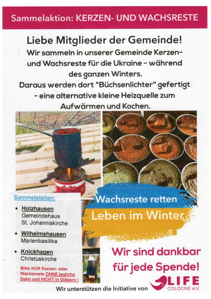 wir sammeln in unserem Kirchspiel, aber auch darüber hinaus, Kerzen- und Wachsreste für die Menschen in der Ukraine und unterstützen damit die Initiative „Life Cologne e.V.“. Daraus werden Büchsenlichter gefertigt. Diese dienen als kleine Heizquelle, zum Kochen, zum Aufwärmen und als Lichtquelle. Wachsreste retten so Leben in der Ukraine. Die Spenden können in den jeweiligen Kirchen abgegeben werden: St. Johanniskirche Holzausen (dort auch am Gemeindehaus, Am Wolfsgarten10), Christuskirche Knickhagen und Marienbasilika Wilhelmshausen. Behälter stehen dort bereit. Bitte nur Wachs- und Kerzenreste OHNE jegliche Deko und NICHT in Gläsern! Wir sind dankbar für jede Spende.