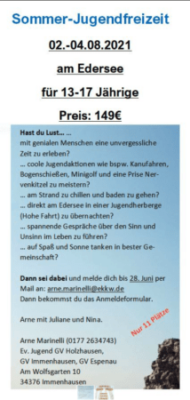 Dann sei dabei und melde dich bis 28.Juni per Mail an: arne.marinelli@ekkw.de Dann bekommst du das Anmeldeformular.