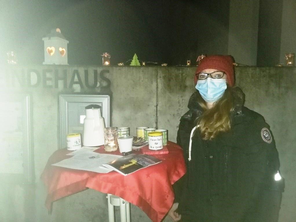 Förderkreissprecherin Sabine Breidenstein beim Aufbau am Gemeindehaus.