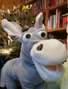 Nun erzählte der Esel Benjamin, der auch auf dem Krippenweg durch die Gemeinde und im Krippenspiel-Gottesdienst am Heiligen Abend eine wichtige Rolle spielte, die Gäste und erzählte allen ganz begeistert, wie er damals vor langer Zeit die schwangere Maria von Nazareth nach Bethlehem getragen und im Stall die Geburt von Jesus miterlebt hatte. Er berichtete auch von dem beschwerlichen Weg, dem hellen Stern, den Hirten und den Sterndeutern aus dem Osten.